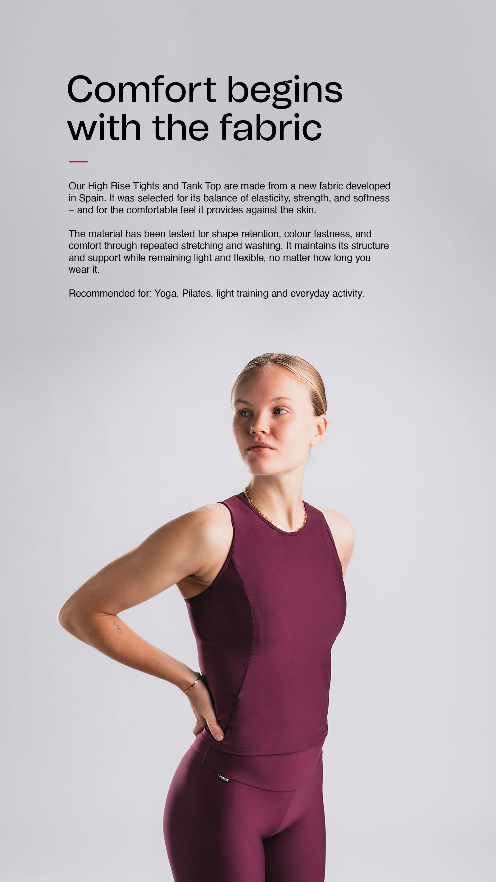 Crafted from the same Spanish fabric as our High Rise Tights, it has a matte, soft surface and a balanced stretch that follows the body without feeling tight. The material maintains its shape, colour, and light support even after repeated wear and washes.
